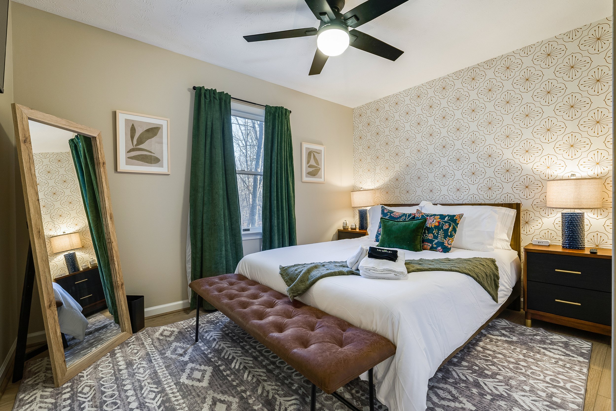 This playfully designed 5-bedroom Massanutten Airbnb sleeps 14 and is all about fun and whimsy, with bold wallpapers, playful neon signs, and bright pops of color in every room. Packed with personality—and amenities like a game room, movie theater, and hot tub—it offers guests a one-of-a-kind experience, not just a place to sleep.